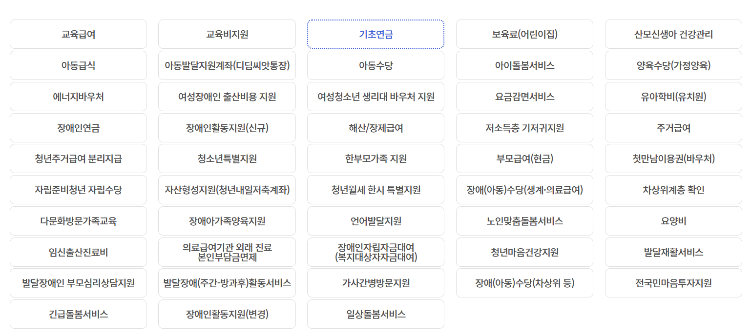 - 기초연금, 기초생활보장, 한부모가족 지원, 장애인연금, 긴급복지 등