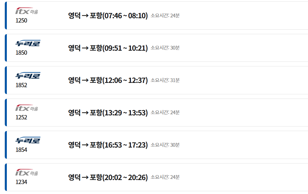 - 포항↔영덕 구간은 무궁화호, ITX-마음 등 다양한 열차 운행