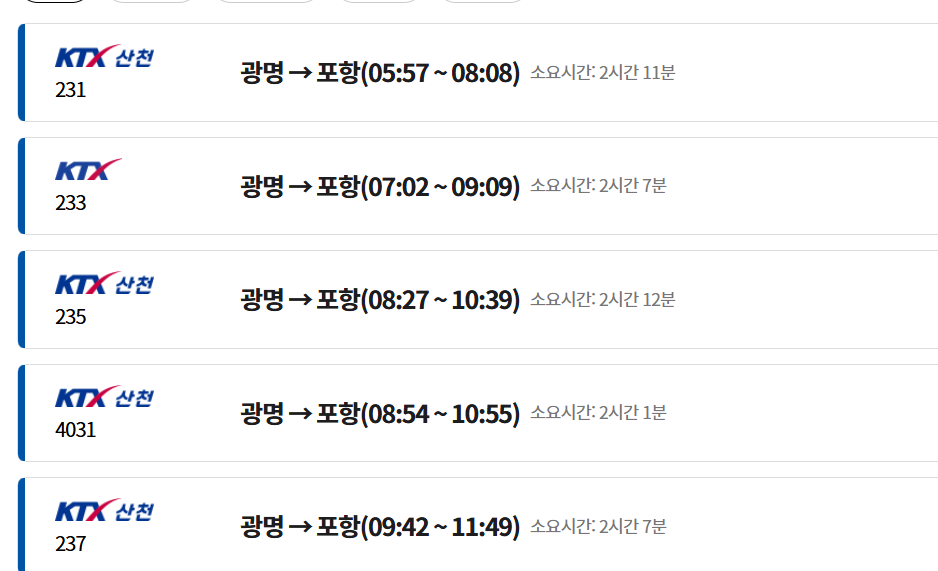 - 15:35 포항 → 17:37 광명 (2시간 2분, 직행)
